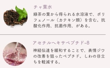 ツボクサ葉水、チャ葉水、ブチレングリコール、アセチルヘキサペプチド-8、アボカド果実エキス、ヒアルロン酸ナトリウム、酢酸トコフェロール、アラントイン
